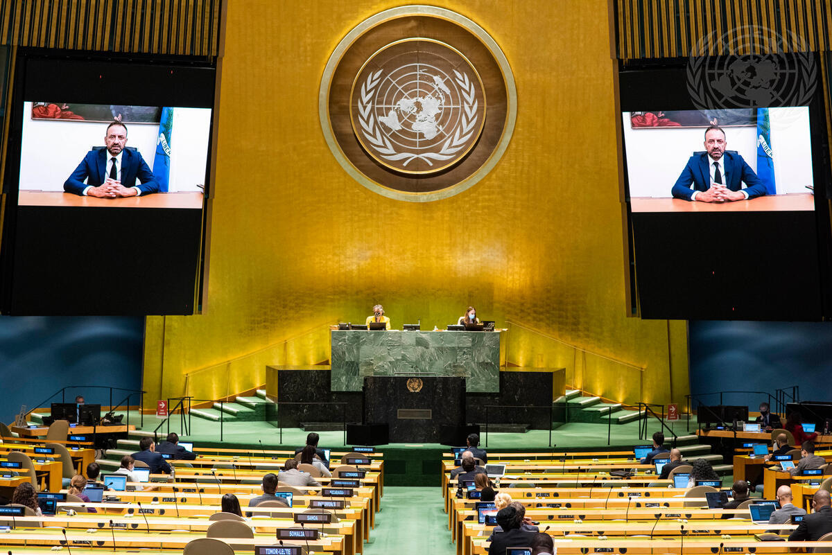 Luca Beccari (on screens), Minister for Foreign Affairs, International Economic Cooperation and Telecommunications of the Republic of San Marino, addresses the general debate of the General Assembly’s seventy-fifth session.