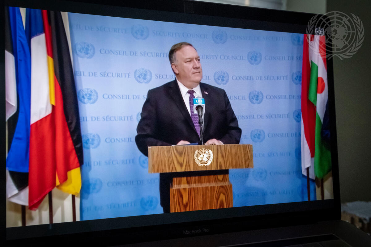 Michael Richard Pompeo, Secretary of State of the United States of America, briefs journalists at the Security Council Stakeout.
