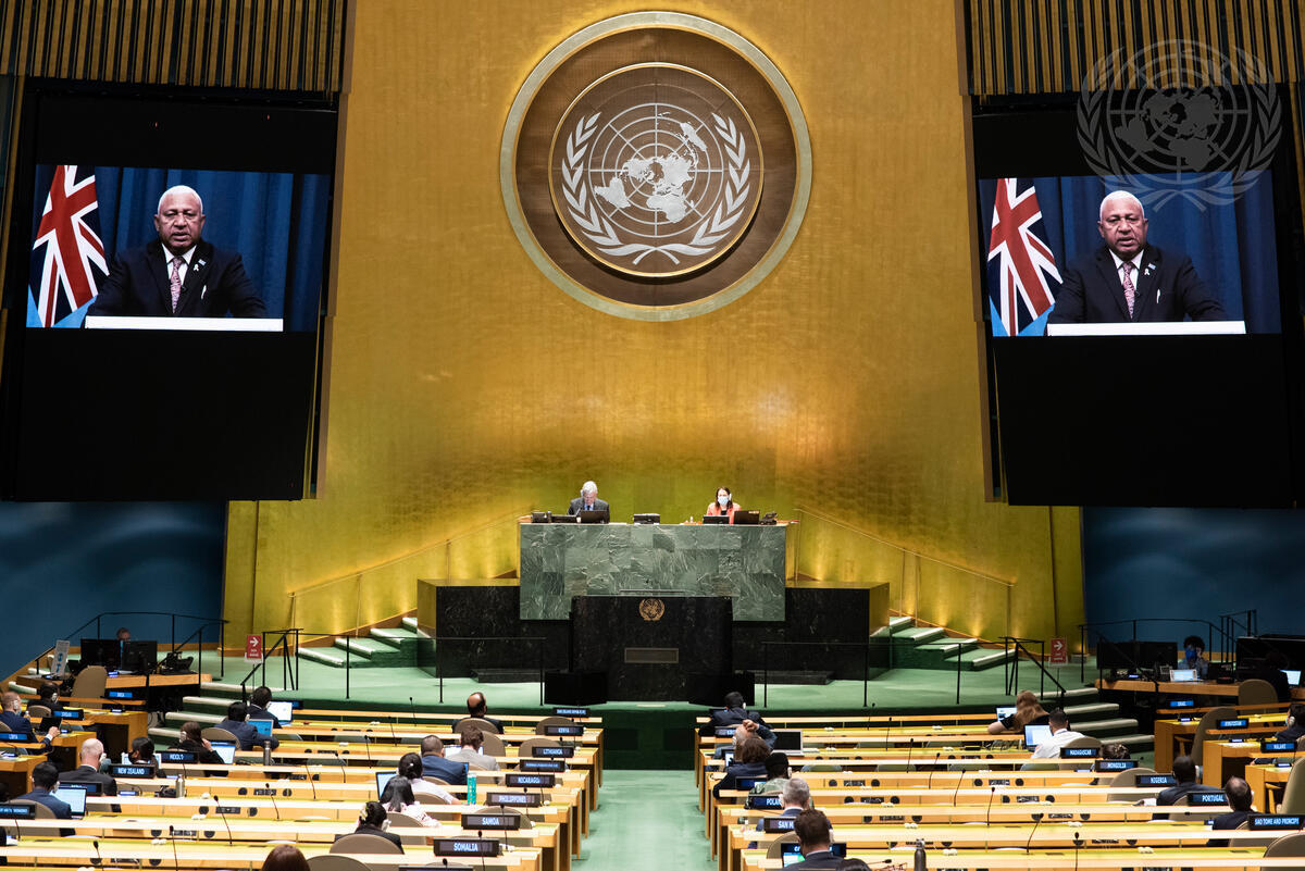 Josaia Voreqe Bainimarama (on screens), Prime Minister and Minister for iTaukei Affairs, Sugar Industry, and Foreign Affairs of the Republic of Fiji, addresses the general debate of the General Assembly’s seventy-fifth session.
