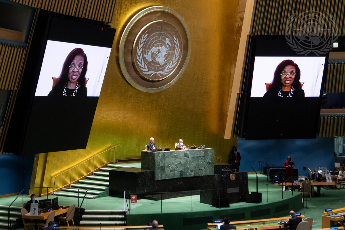 Hilary Gbedemah (on screens), Chair of the Committee on the Elimination of Discrimination Against Women, addresses the General Assembly high-level meeting on the twenty-fifth anniversary of the Fourth World Conference on Women.