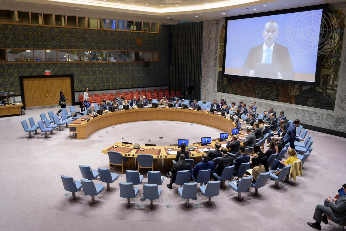 A wide view of the Security Council as Nickolay Mladenov (on screens), Special Coordinator for the Middle East Peace Process and Personal Representative of the Secretary-General, briefs the Council on the situation in the Middle East, including the Palestinian question.