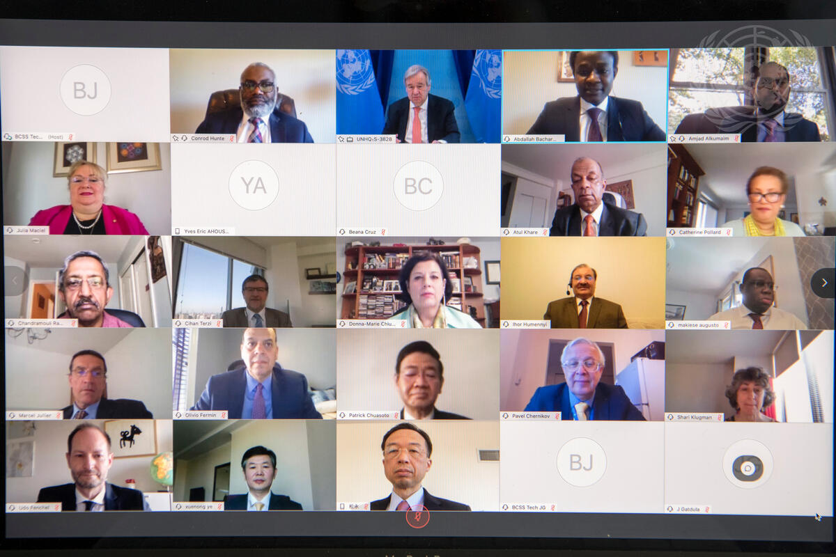 Secretary-General António Guterres (upper middle screen) introduces the Proposed Programme Budget for 2021 to the Advisory Committee on Administrative and Budgetary Questions (ACABQ) virtually.
