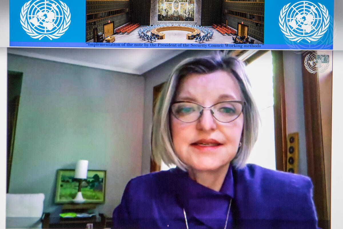 Karin Landgren, Executive Director of Security Council Report, briefs the open video conference with Security Council members in connection with ""Implementation of the Note by the President of the Security Council (S/2017/507): Working methods"".