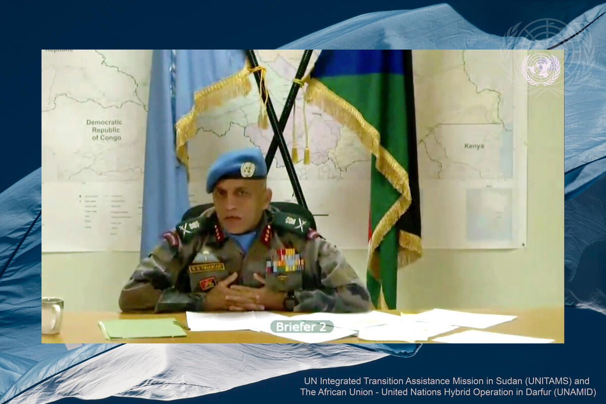 Lieutenant-General Shailesh Tinaikar, Force Commander with the UN Mission in South Sudan (UNMISS), addresses the open video conference with Security Council members in connection with United Nations peacekeeping operations.