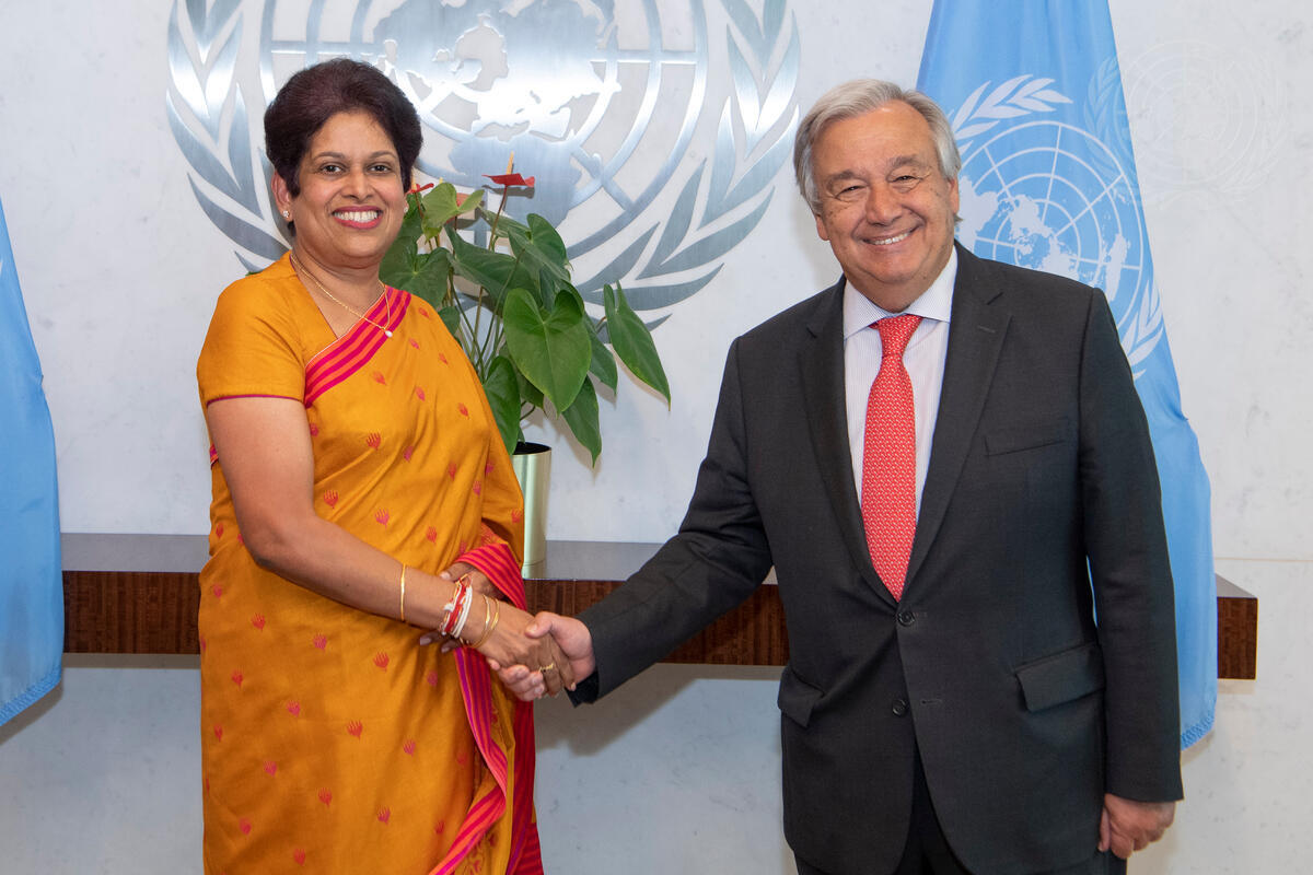 Kshenuka Dhireni Senewiratne (left), new Permanent Representative of the Democratic Socialist Republic of Sri Lanka to the United Nations, presents her credentials to Secretary-General António Guterres.