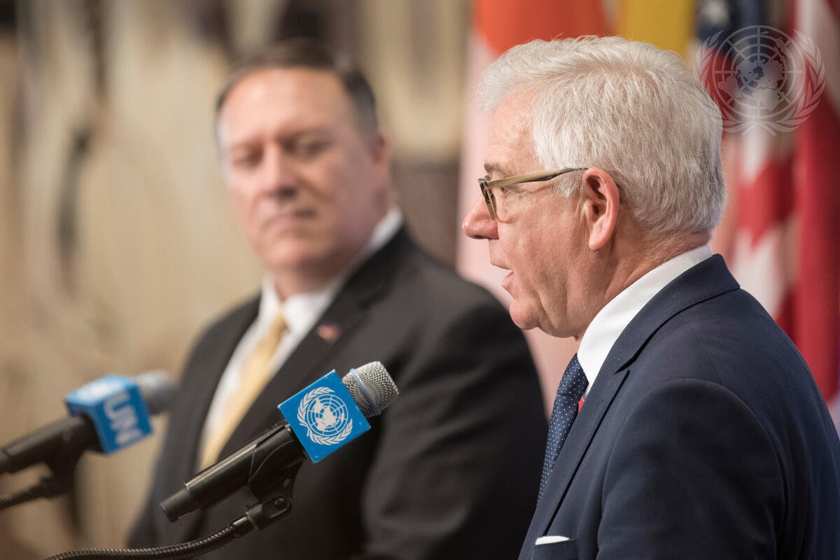 Jacek Czaputowicz (right), Minister for Foreign Affairs of the Republic of Poland and President of the Security Council for the month of August, briefs correspondents following the Security Council meeting on challenges to peace and security in the Middle East. Also present is Michael Richard Pompeo (left, podium), Secretary of State of the United States of America.