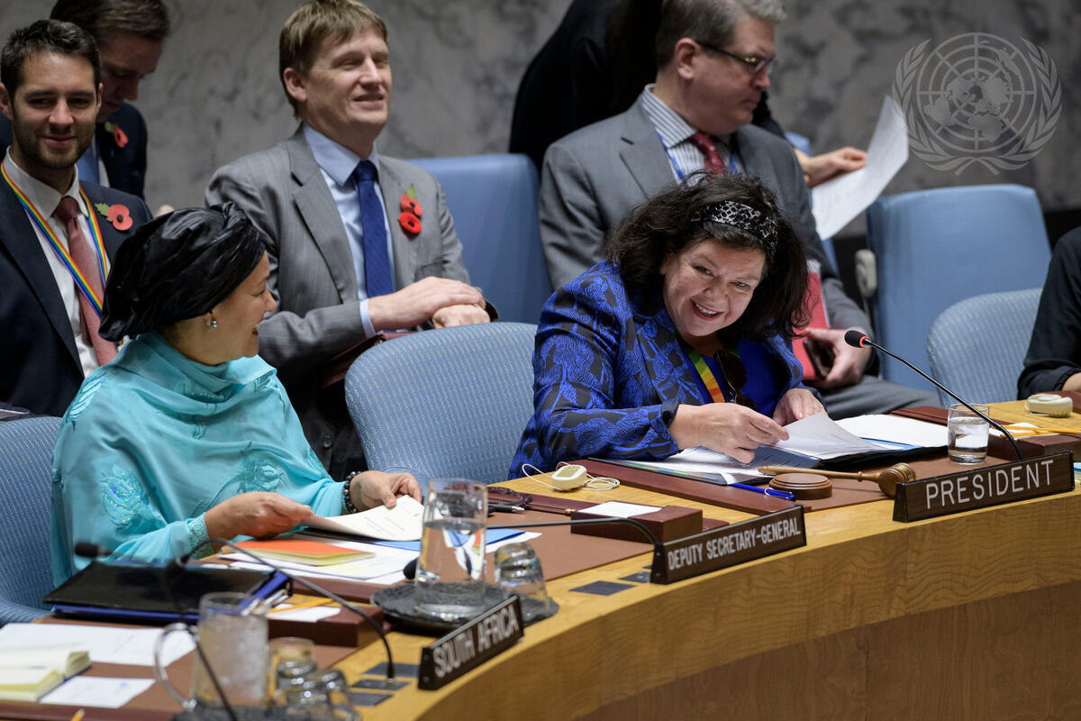 Karen Pierce, Permanent Representative of the United Kingdom to the United Nations and President of the Security Council for the month of November, chairs the Security Council meeting on the situation in Guinea-Bissau. At left is Deputy Secretary-General Amina J. Mohammed.