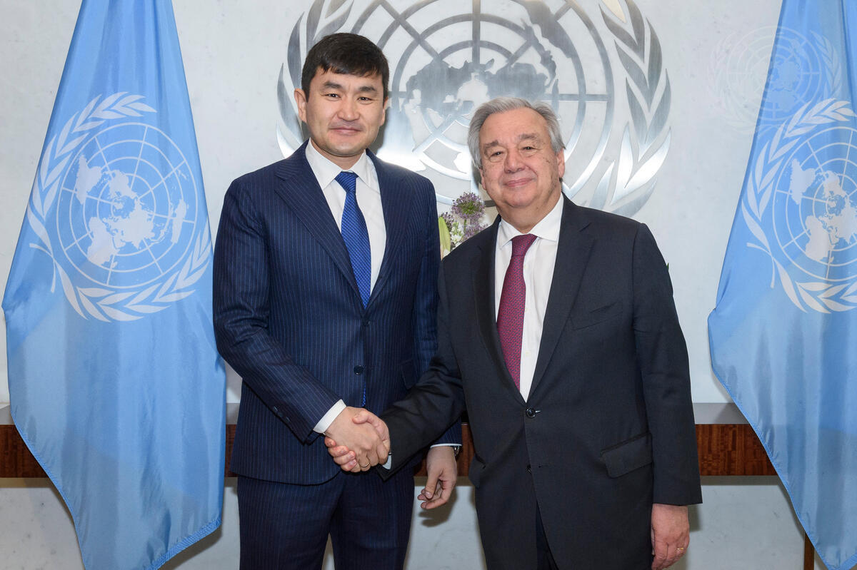 Sukhbold Sukhee (left), Permanent Representative of Mongolia to the United Nations, pays a farewell call on Secretary-General António Guterres.