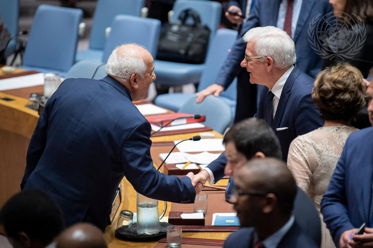 Riyad H. Mansour (left), Permanent Observer of the State of Palestine to the United Nations, greets Jacek Czaputowicz, Minister for Foreign Affairs of the Republic of Poland and President of the Security Council for the month of August, ahead of the Security Council meeting on challenges to peace and security in the Middle East.