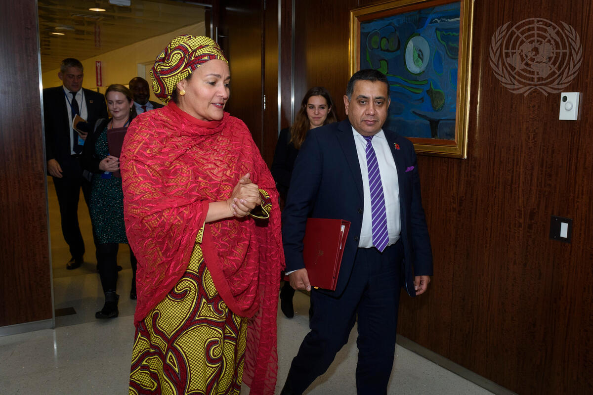 Deputy Secretary-General Amina J. Mohammed (left) meets with Tariq Mahmood Ahmad of Wimbledon, Minister of State for the Commonwealth and the United Nations of the United Kingdom of Great Britain and Northern Ireland.