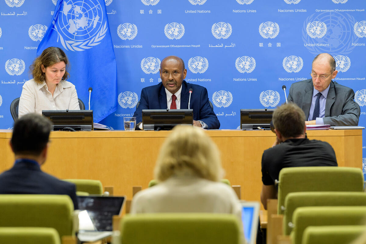 Judge Abduylqawi A. Yusuf, President of the International Court of Justice (ICJ), briefs journalists on the Court’s role and jurisdiction, its latest activities and an overview of its current caseload. At right is Philippe Gautier, Registrar of the International Court of Justice.