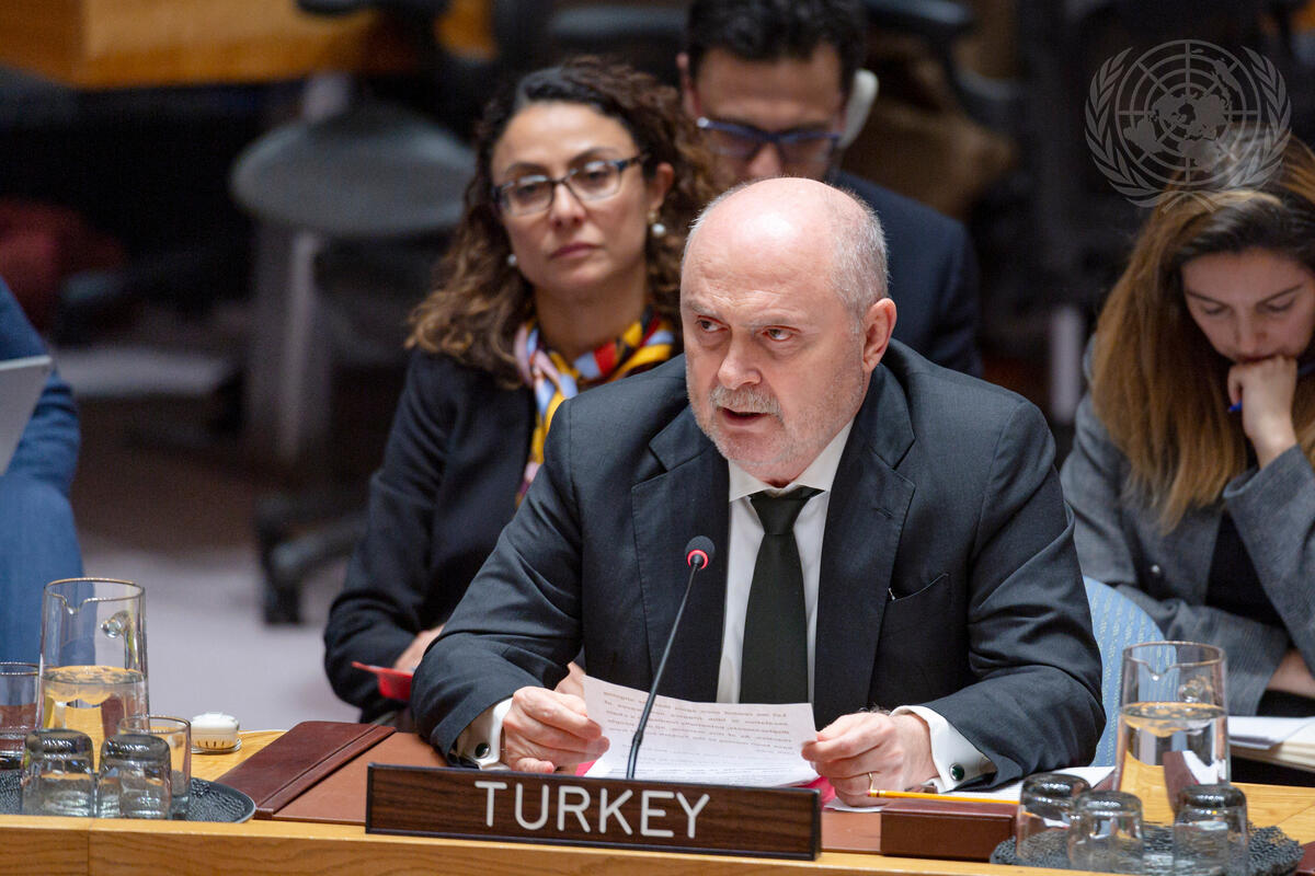 Feridun Hadi Sinirlioglu, Permanent Representative of Turkey to the United Nations, delivers a statement to members of the Security Council during a meeting on the situation in Syria.