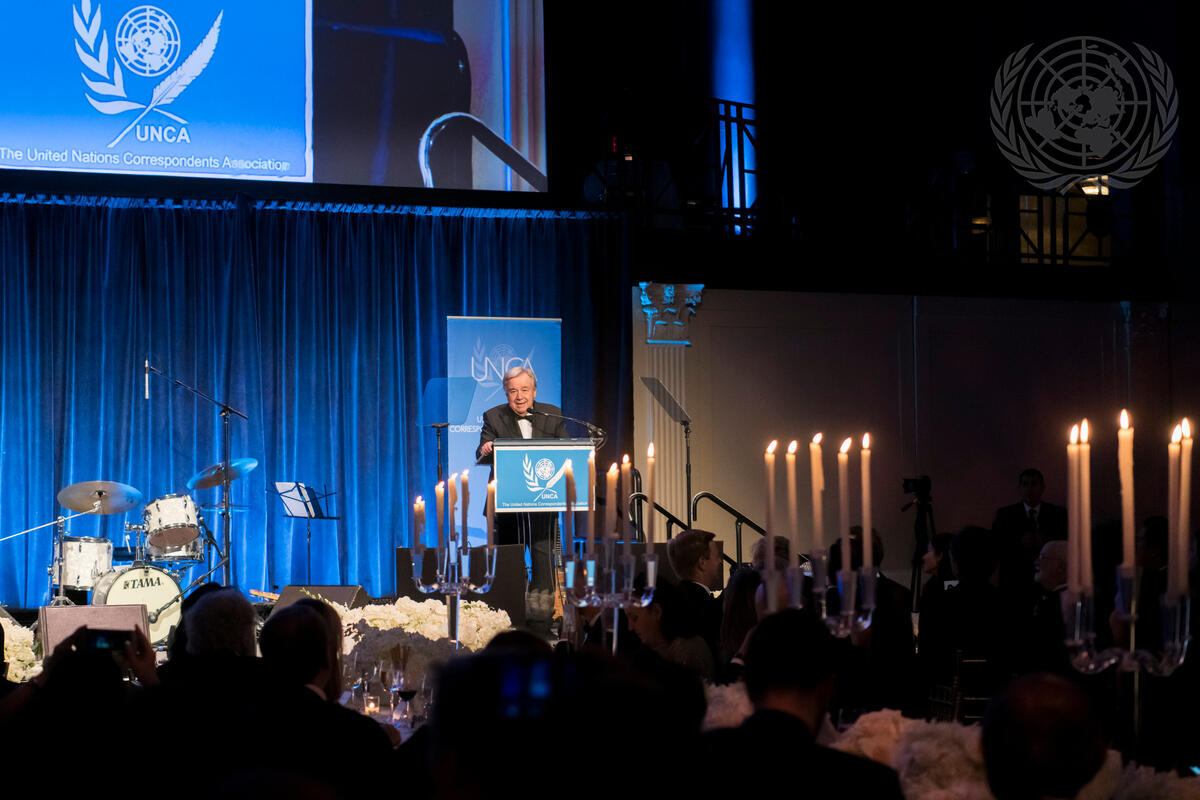 Secretary-General António Guterres (at podium) speaks at the annual awards dinner of the UN Correspondents Association (UNCA).
