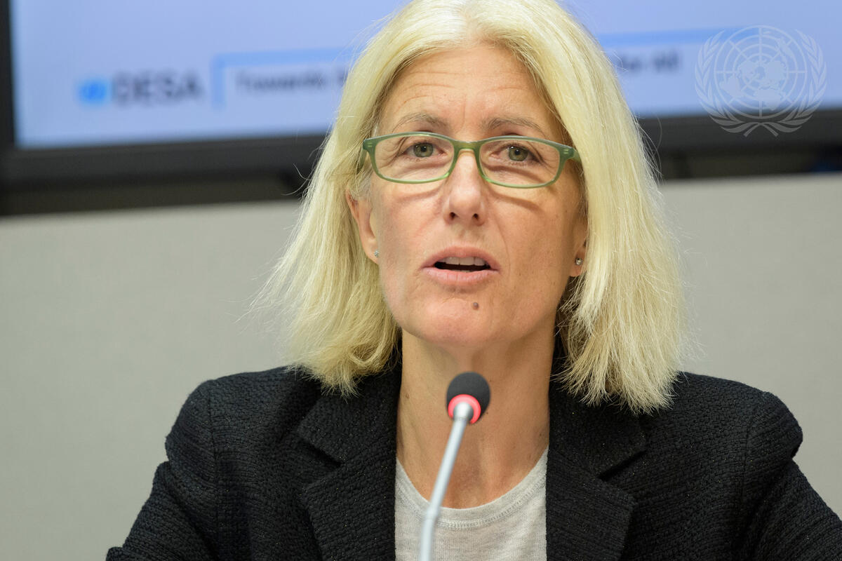 Marta Roig, Chief of Emerging Trends and Issues of the Department of Economic and Social Affairs (DESA), briefs reporters on the launch of the 2020 World Social Report. With her is Elliot Harris (not pictured), UN Chief Economist and Assistant Secretary-General for Economic Development.