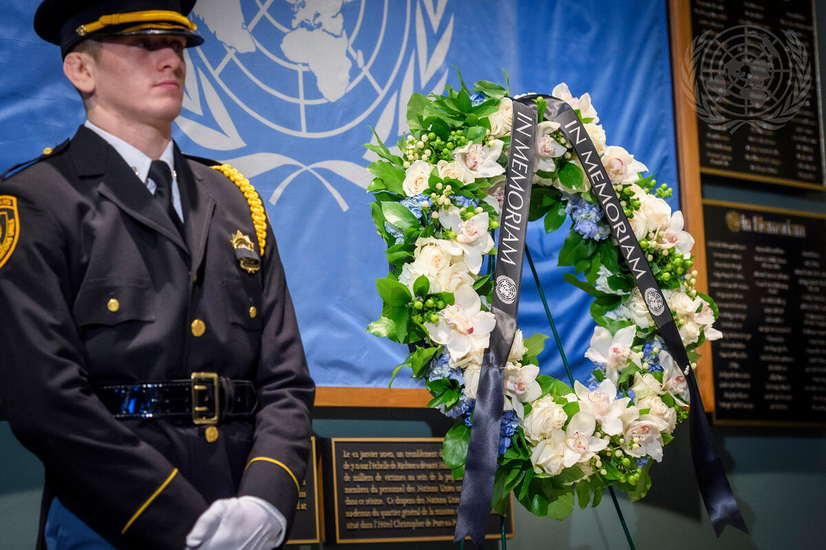 A UN Security Officer stand at attention by the wreath during the commemoration of the tenth anniversary of the 12 January 2010 Haiti Earthquake at UN headquarters.