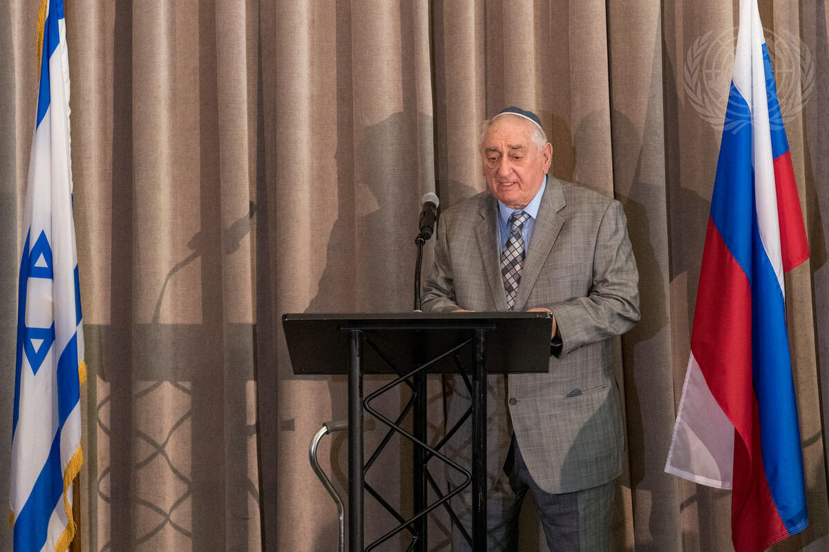 Zoltan Matyash, Holocaust survivor of Auschwitz and Buchenwald, addresses the opening of the exhibition commemorating the 75th Anniversary of the Liberation of Auschwitz-Birkenau.