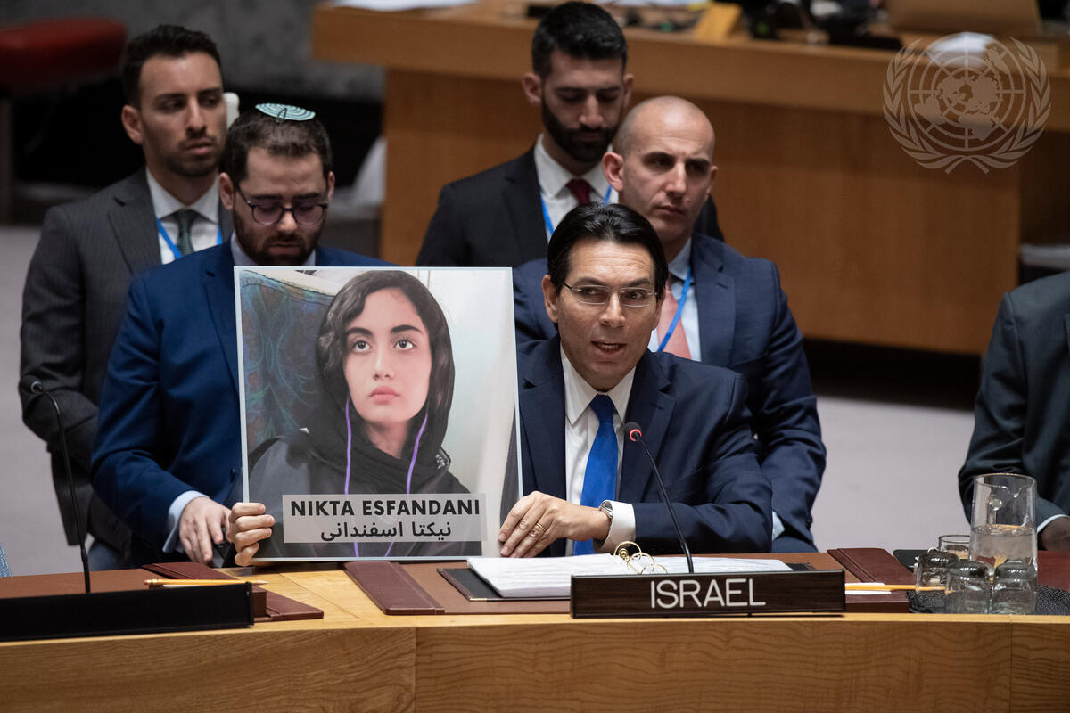 Danny Danon, Permanent Representative of Israel to the United Nations, holds a photo of Nikta Esfandani as he addresses the Security Council meeting on the situation in the Middle East, including the Palestinian question.