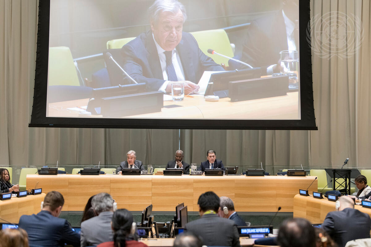 Secretary-General António Guterres (left at dais and on screen) briefs the General Assembly meeting on his Priorities for 2020 and the Work of the Organization. In the centre is Tijjani Muhammad-Bande, President of the seventy-fourth session of the United Nations General Assembly, and at right is Movses Abelian, Under-Secretary-General for General Assembly and Conference Management.