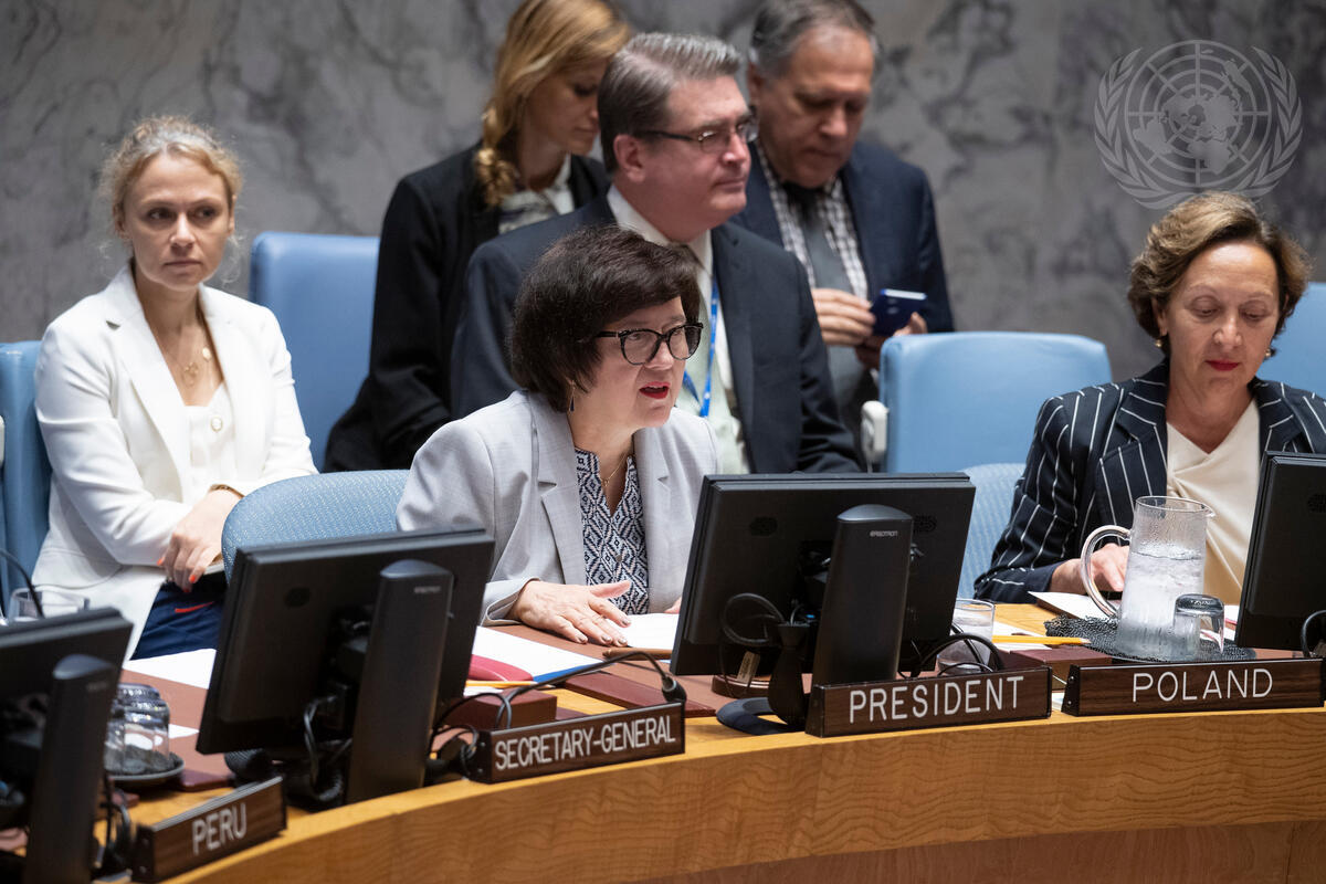 Joanna Wronecka, Permanent Representative of the Republic of Poland to the United Nations and President of the Security Council for the month of August, chairs the Security Council meeting on the situation in the Sudan and South Sudan. At right is Hasmik Egian, Director of the Security Council Affairs Division of the Department of Political and Peacebuilding Affairs (DPPA).