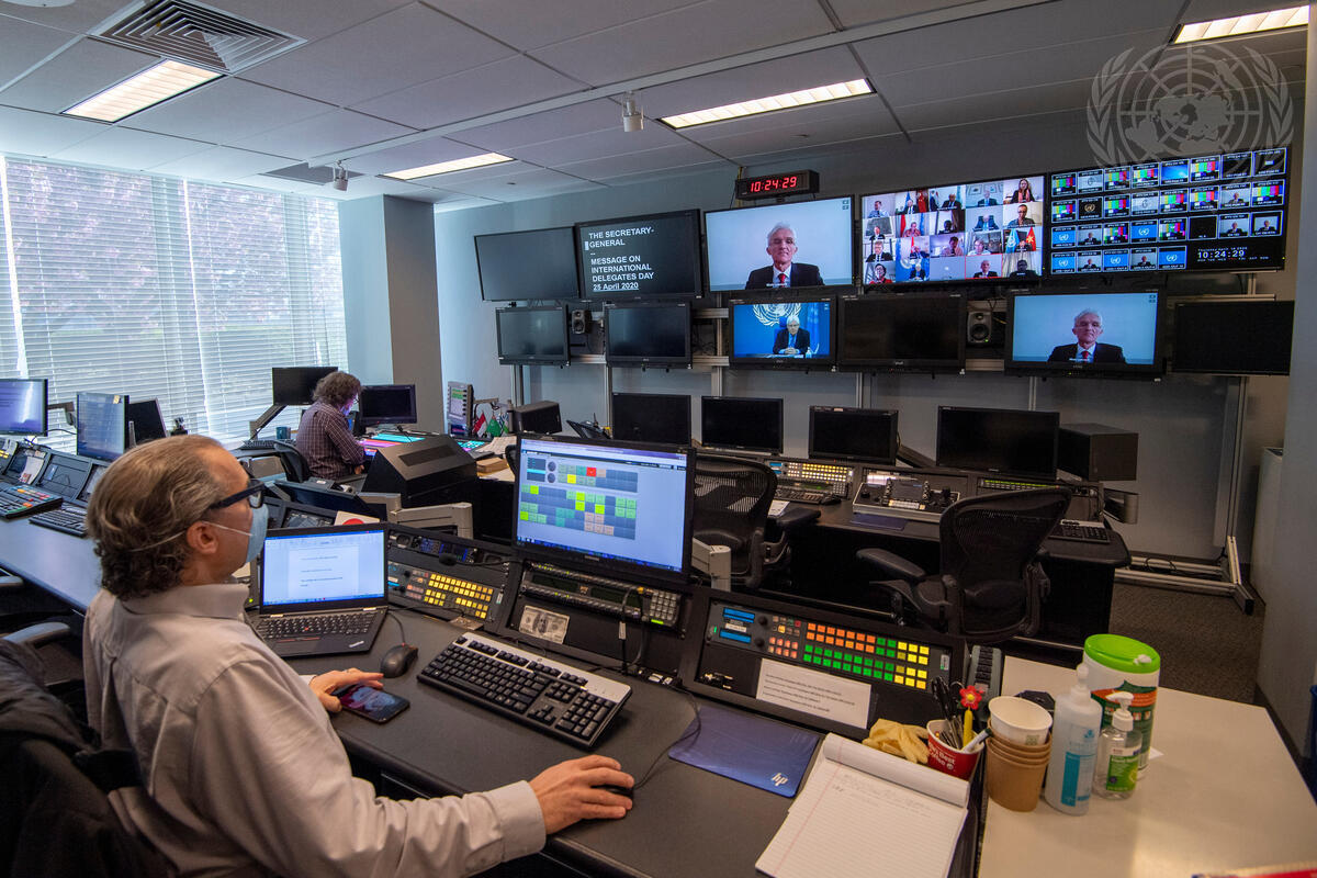 A view from the UNTV studio as Mark Lowcock, Under-Secretary-General for Humanitarian Affairs and Emergency Relief Coordinator, briefs members of the Security Council during an open video conference in connection with the situation in the Middle East (Yemen).
