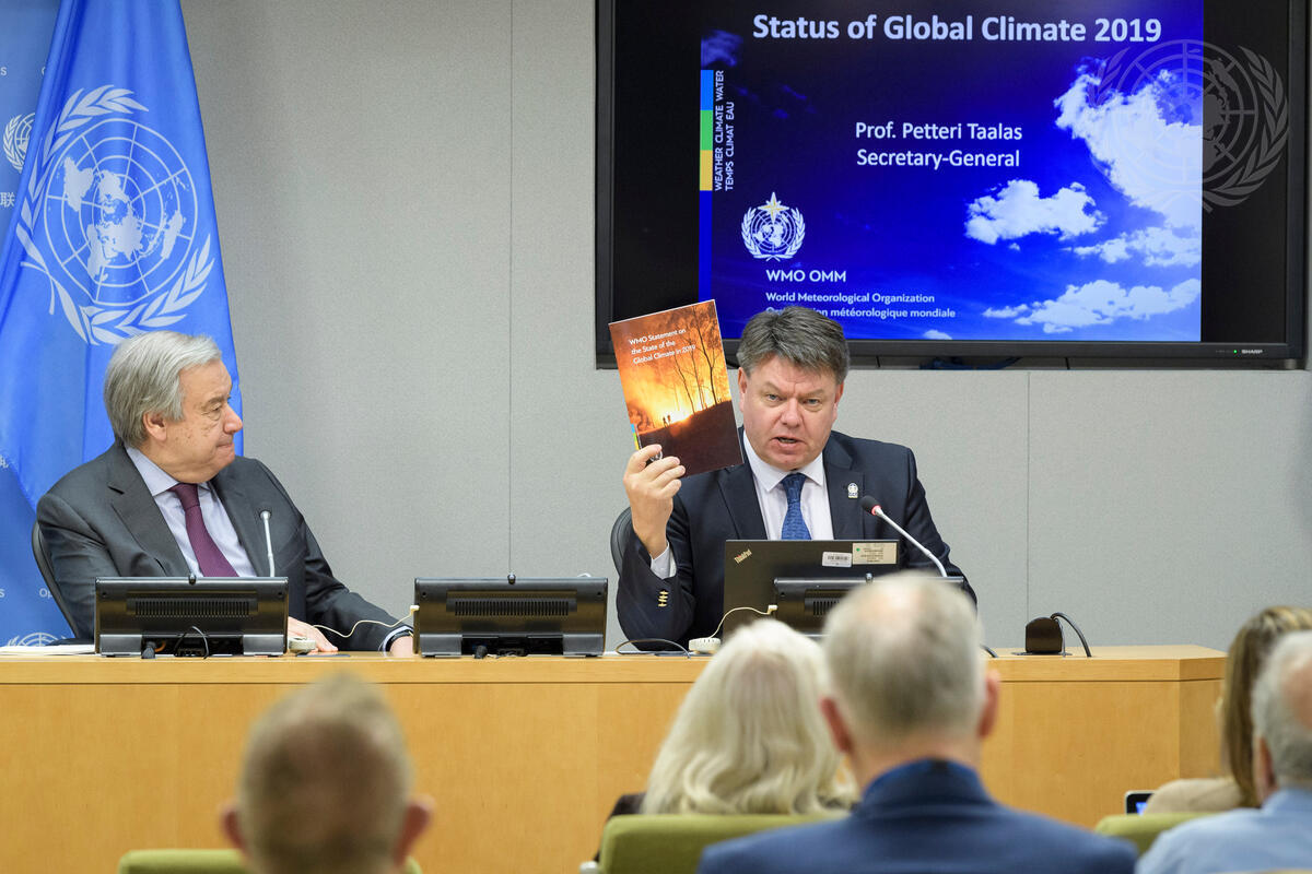 Secretary-General António Guterres (left) and Petteri Taalas, Secretary-General of the World Meteorological Organization (WMO) brief reporters on WMO State of the Climate 2019 Report.