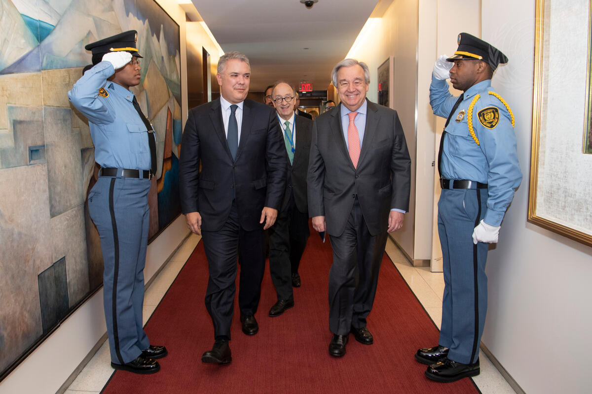 Secretary-General António Guterres (centre right) meets with Iván Duque Márquez, President of the Republic of Colombia. In the centre in the back is Guillermo Fernández de Soto Valderrama, Permanent Representative of the Republic of Colombia to the United Nations.