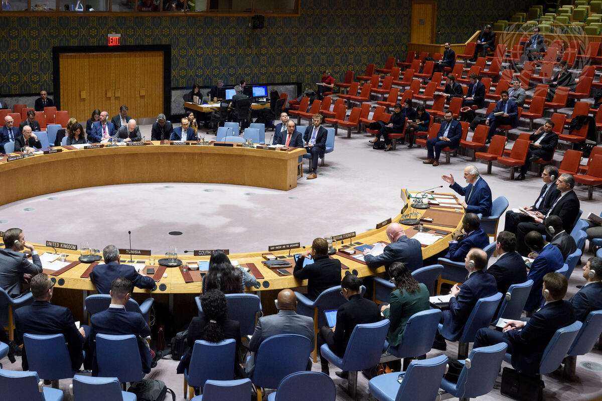 A wide view of the Security Council as Bashar Ja’afari (right end of the table), Permanent Representative of the Syrian Arab Republic to the United Nations, addresses the Security Council meeting on the situation in the Middle East (Syria).