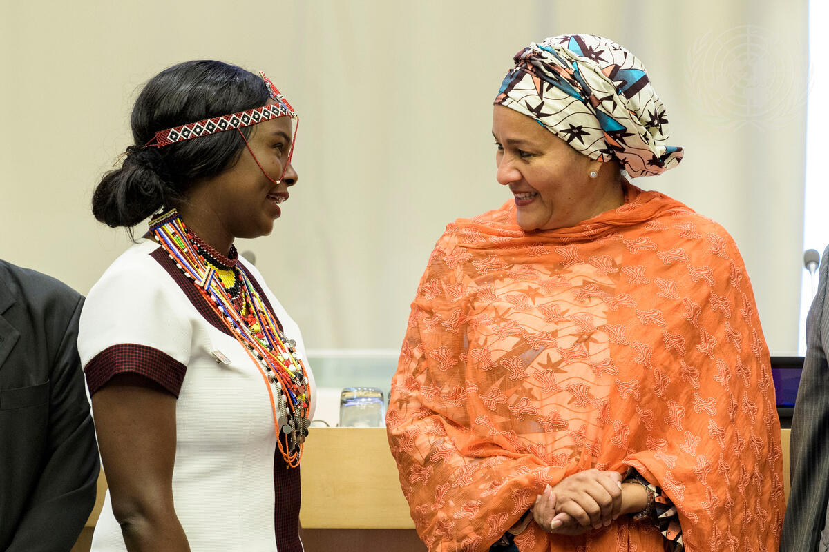 Deputy Secretary-General Amina Mohammed (right) speaks with Silvia Museiya from the Yiaku indigenous community of the Mukogodo forest in Kenya, prior to the event to commemorate the International Day of the World’s Indigenous People. Ms. Museiya is an advocate for the rights of indigenous peoples and chairperson of the Indigenous People National Steering Committee on Climate Change. The focus of this year’s International Day is Indigenous Peoples’ Languages in view of 2019 being marked as the International Year of Indigenous Languages.
