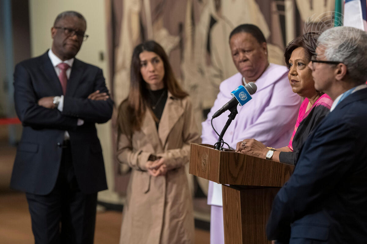 From left to right are: Denis Mukwege, Medical Director of Panzi Hospital and 2018 Nobel Peace Prize recipient; Nadia Murad, Nobel Laureate and Goodwill Ambassador for the Dignity of Survivors of Human Trafficking of the United Nations Office on Drugs and Crime (UNODC); Naledi Pandor, Minister of International Relations and Cooperation of the Republic of South Africa; and (at right) Farhan Haq, Deputy Spokesperson for the Secretary-General.