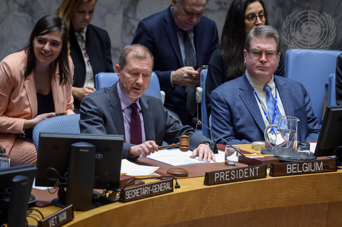 Marc Pecsteen de Buytswerve, Permanent Representative of Belgium to the United Nations and President of the Security Council for the month of February, chairs the Security Council meeting on the situation in the Middle East.