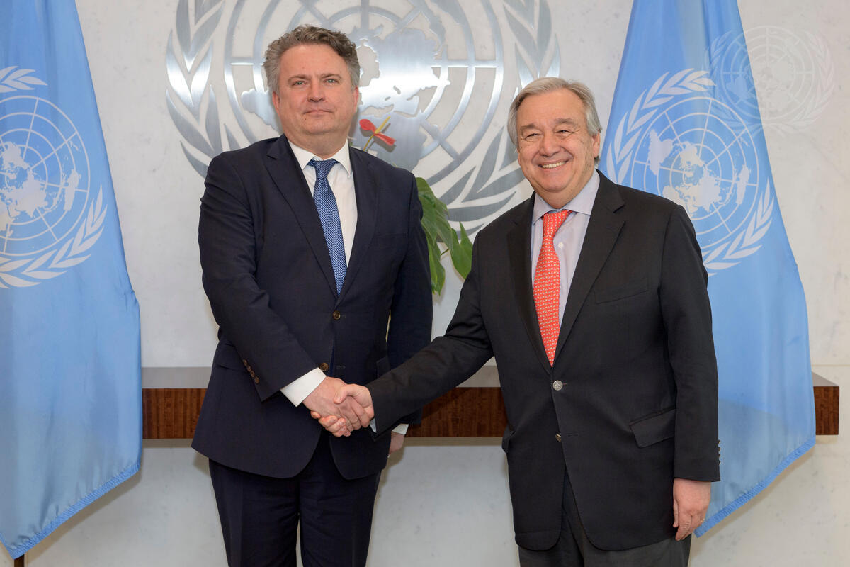 Sergiy Kyslytsya (left), new Permanent Representative of Ukraine to the United Nations, presents his credentials to Secretary-General António Guterres.