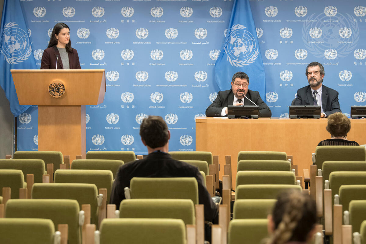 Can Ünver (seated left), Chairperson of the Committee on Migrant Workers of the Office of the High Commissioner for Human Rights, briefs correspondents. At right is Felipe González Morales, Special Rapporteur on the Human Rights of Migrants.