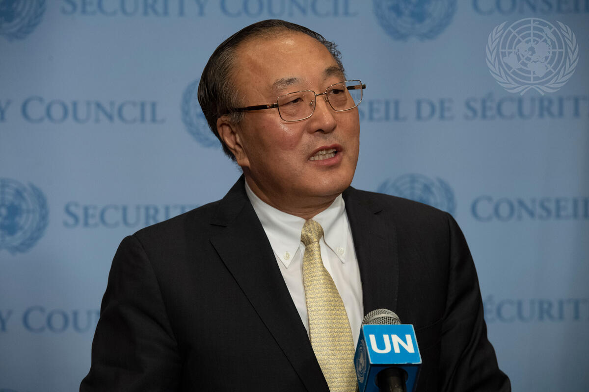 Zhang Jun, Permanent Representative of China to the United Nations, briefs correspondents following Security Council consultations on the situation in India and Pakistan.