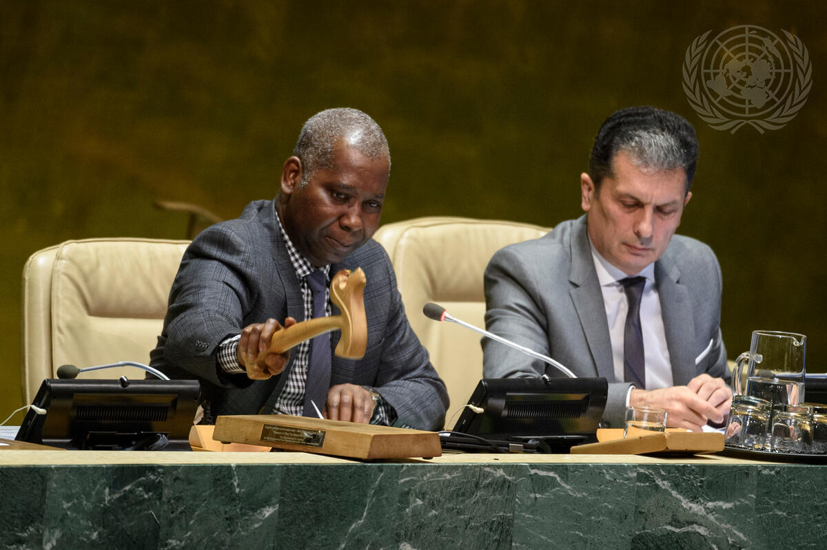 Tijjani Muhammad-Bande (left), President of the seventy-fourth session of the General Assembly, chairs the election of fourteen new members of the Human Rights Council. Also present is Movses Abelian, Under-Secretary-General for General Assembly and Conference Management.