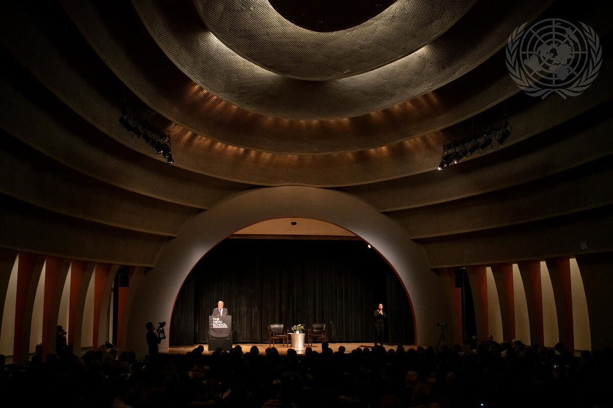 Secretary-General António Guterres (at podium) delivers remarks on the topic of “Women and Power” at the New School in New York. He outlined five areas in which closing the gender power gap will benefit everyone and transform our world.