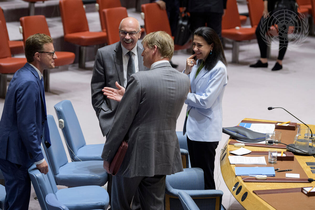 Michèle Coninsx (right), Executive Director of the Counter-Terrorism Committee Executive Directorate, and Vladimir Voronkov (facing the camera), Under-Secretary-General, United Nations Office of Counter-Terrorism, speaks with Mariusz Lewicki (left), Deputy Permanent Representative of the Republic of Poland to the UN, and Jonathan Allen, Deputy Permanent Representative of the United Kingdom to the UN, after the Security Council meeting on threats to international peace and security caused by terrorist acts. The Council heared a report of the Secretary-General on the threat posed by ISIL (Da’esh) to international peace and security and the range of United Nations efforts in support of Member States in countering the threat.
