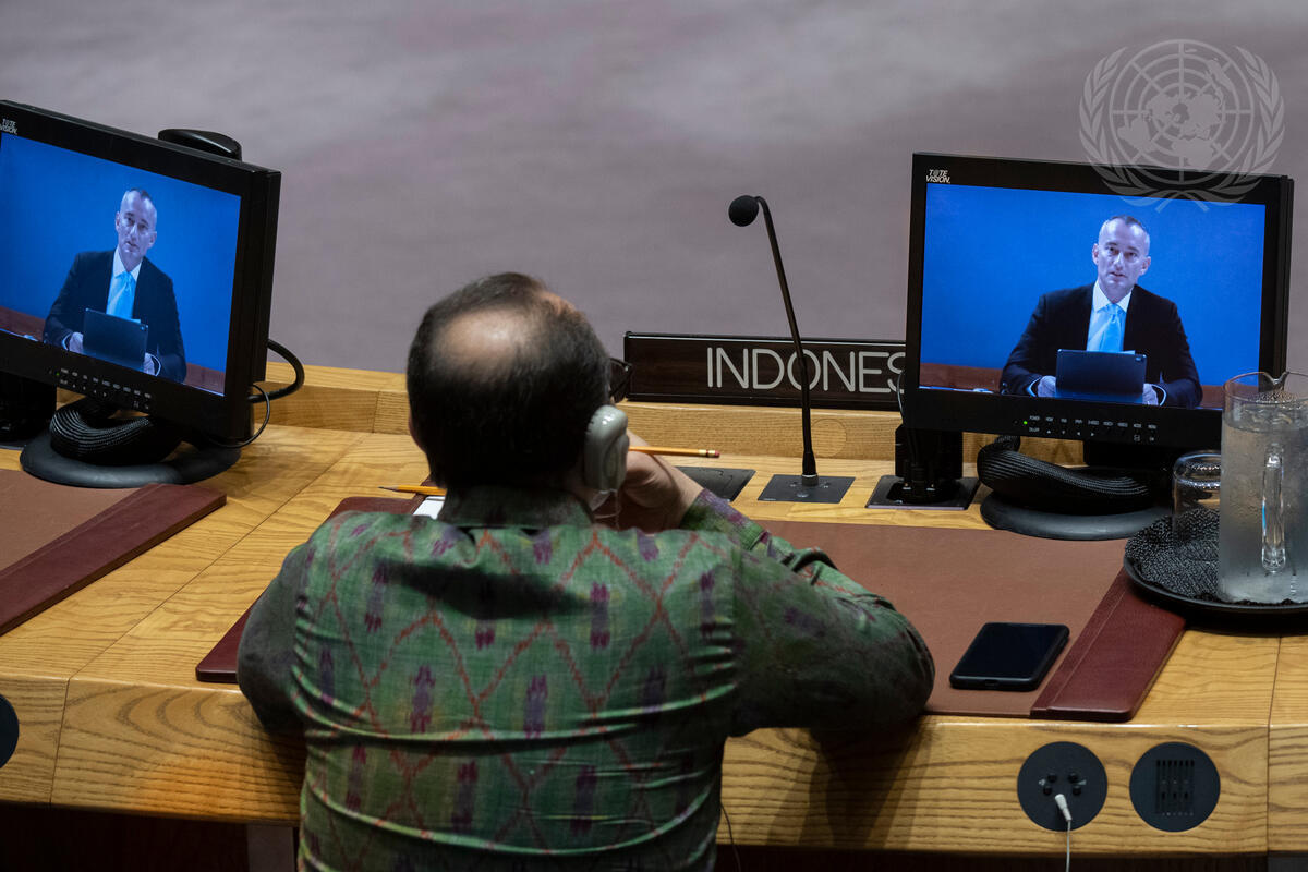 Muhsin Syihab, Deputy Permanent Representative of Indonesia to the United Nations, listens to Nickolay Mladenov (on screens), Special Coordinator for the Middle East Peace Process and Personal Representative of the Secretary-General, as he briefs the Security Council on the situation in the Middle East, including the Palestinian question.