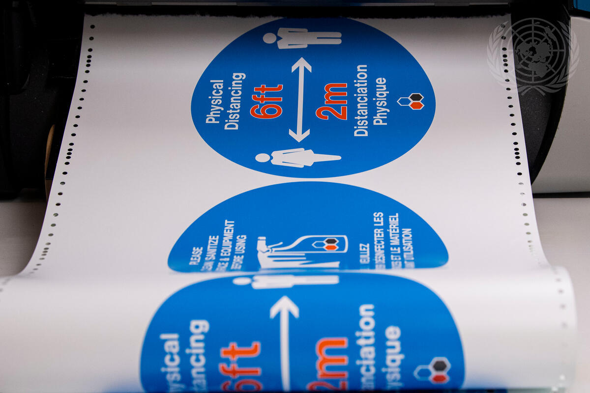 Detail of sign to promote social distancing among UN staff when they return to the office.