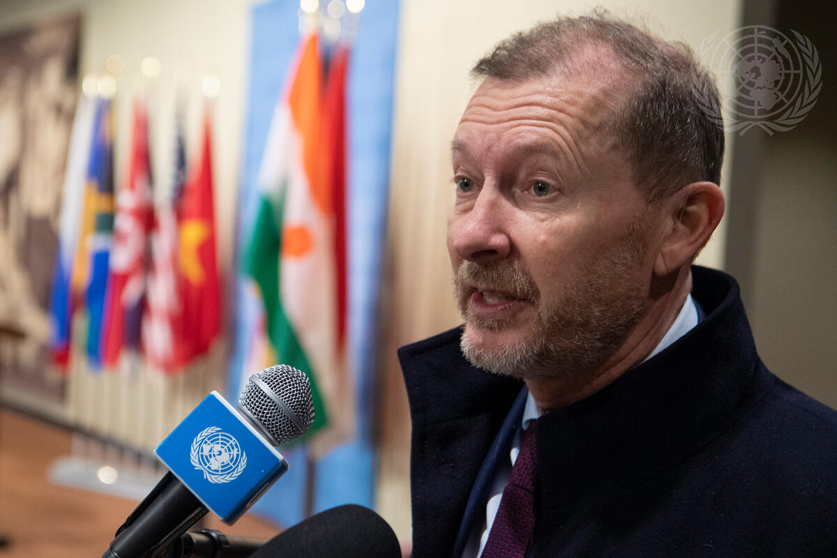 Marc Pecsteen de Buytswerve, Permanent Representative of Belgium to the United Nations and President of the Security Council for the month of February, briefs reporters ahead of the Security Council meeting on the situation in Guinea-Bissau.