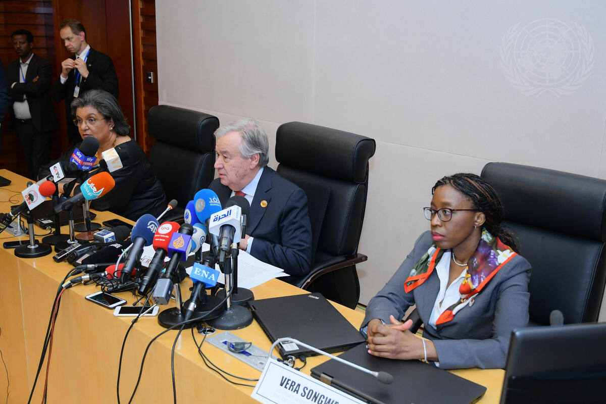 Mr. Guterres (centre) briefs reporters during the 33rd African Union Summit in Addis Ababa. At right is Vera Songwe, Executive Secretary of the UN Economic Commission for Africa.