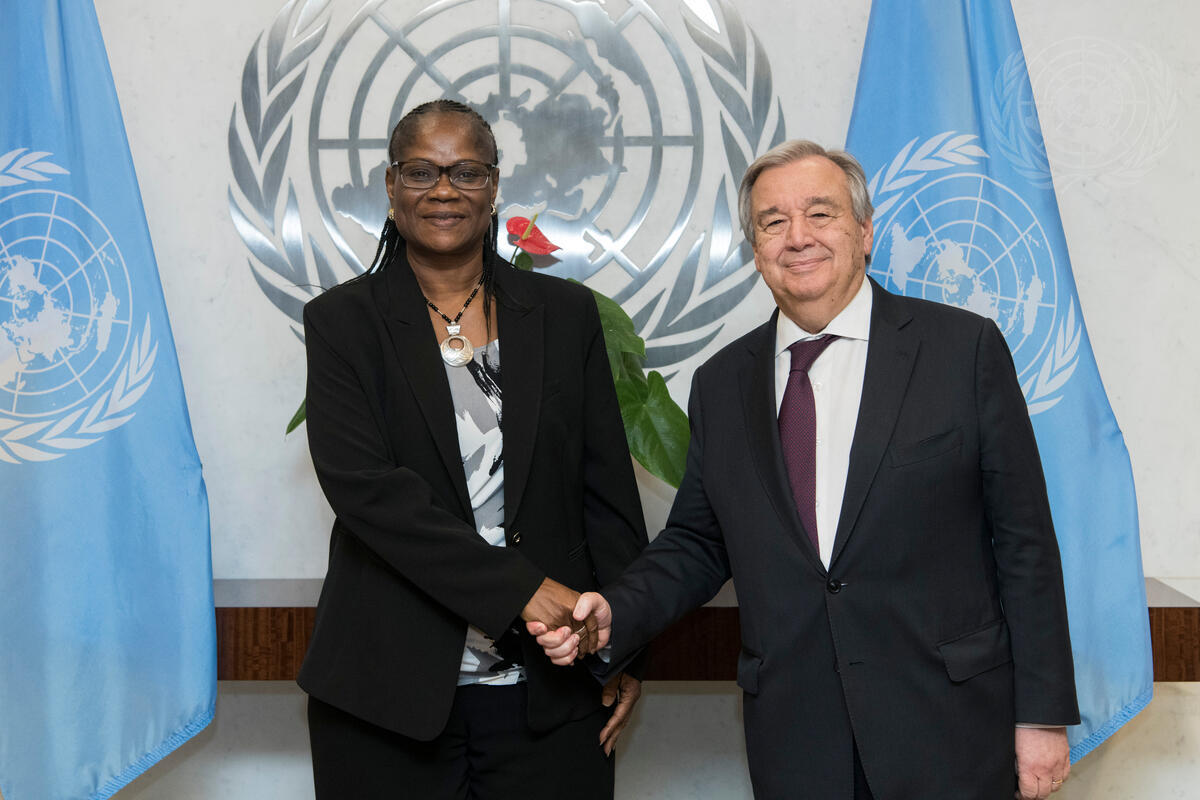 Secretary-General António Guterres (right) meet with Rosine Sori-Coulibaly, Special Representative for Guinea-Bissau and Head of the United Nations Integrated Peacebuilding Office in Guinea-Bissau (UNIOGBIS).