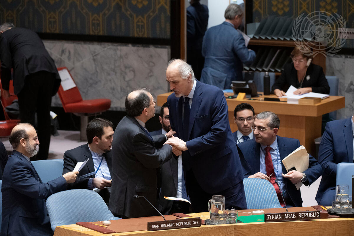 Bashar Ja’afari (right), Permanent Representative of the Syrian Arab Republic to the United Nations, greets Majid Takht Ravanchi, Permanent Representative of the Islamic Republic of Iran to the United Nations, after the Security Council meeting on the situation in Syria.