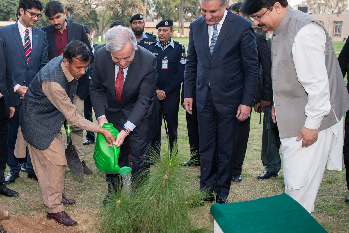 Mr. Guterres (centre left) participates in a tree planting ceremony with Makhdoom Shah Mahmood Hussain Qureshi (centre right), Minister for Foreign Affairs of Pakistan.