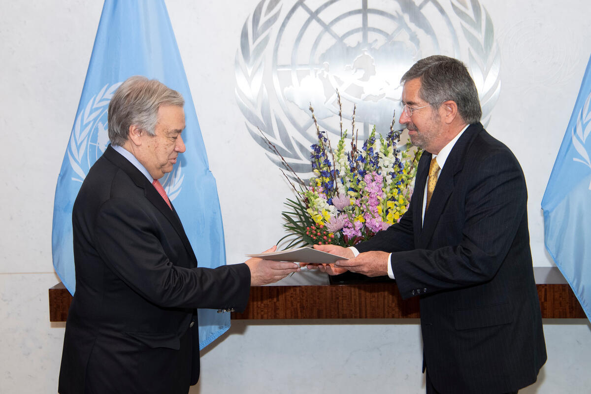 Juan Ramón de la Fuente Ramírez (right), new Permanent Representative of Mexico to the United Nations, presents his credentials to Secretary-General António Guterres.