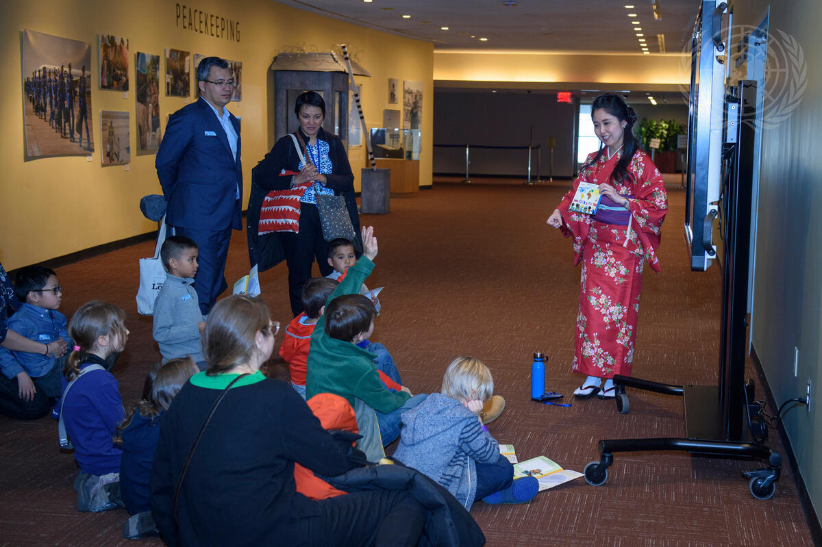 Emi Araki (right), a United Nations tour guide from Japan, explains the nature of the Organization to a group of young visitors during the UN Kids Day.