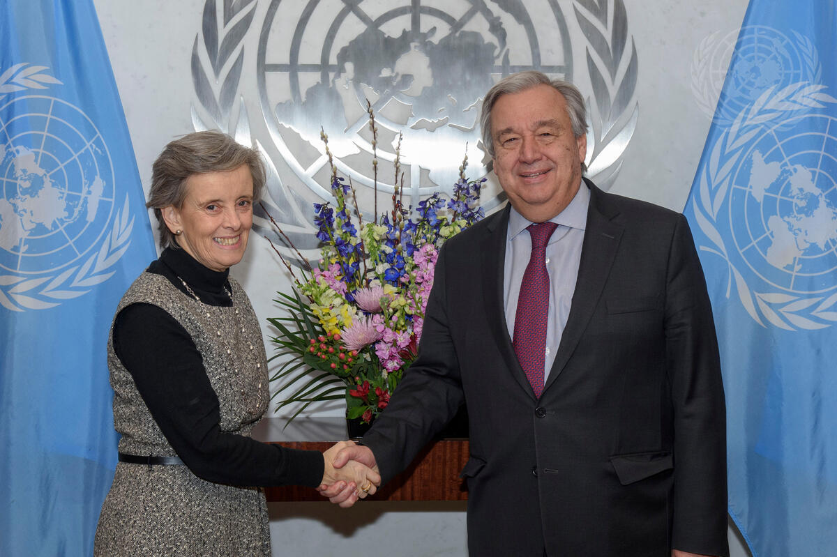 Secretary-General António Guterres (right) meets with Marta Santos Pais, Special Representative on Violence Against Children.