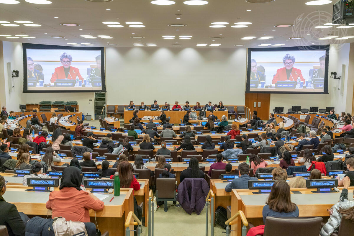 A wide view of the high-level panel on the theme ""Investing in Science and Technology Education for Shaping Society’s Future"", held as part of the fourth commemoration of the International Day of Women and Girls in Science (11 February). Katalin Bogyay, Permanent Representative of Hungary to the United Nations (on screens), moderates the discussion.