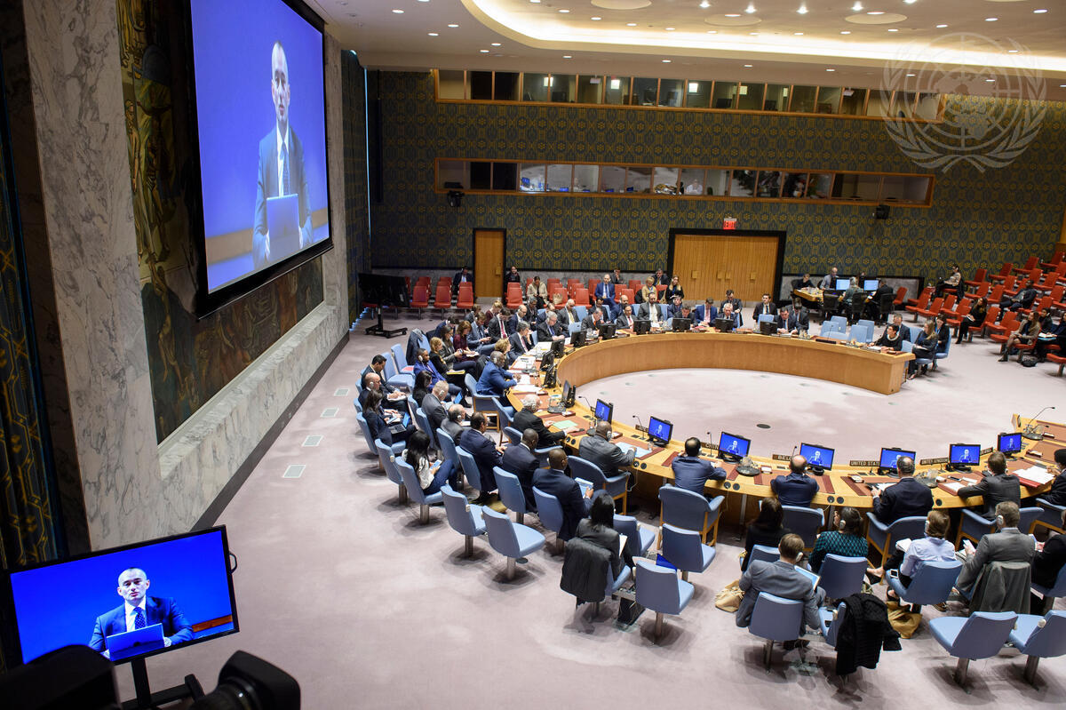 A wide view of the Security Council Chamber as Nickolay Mladenov (on screens), UN Special Coordinator for the Middle East Peace Process and Personal Representative of the Secretary-General to the Palestine Liberation Organization and the Palestinian Authority, briefs the Council on the situation in the Middle East, including the Palestinian question.