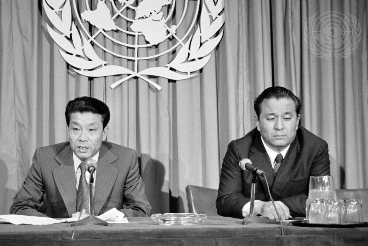 Han Si Hae (left), the Democratic People's Republic of Korea Permanent Observer to the United Nations, at a press conference this morning on "the grave political situation prevailing in South Korea."