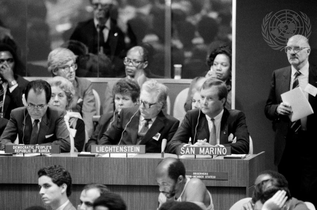 Listening to the proceedings of the 48th plenary meeting of the General Assembly this morning as observers (left to right): Prime Minister Shinyong Lho, Republic of Korea; Prince Nicholas of Liechtenstein; and Consul, Jose Riba of San Marino.